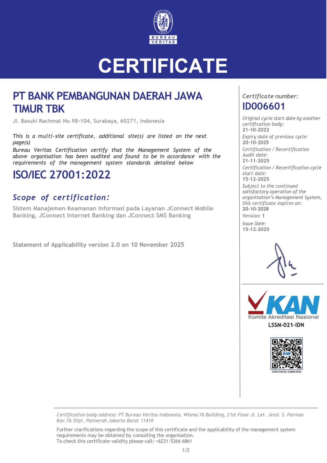 ISO 37001Integrity without compromise! Bank Jatim fully supports the ISO 37001 movement to strengthen the prevention of corruption and bribery across all operational lines. This step is our tangible contribution in building a healthy and trusted banking culture for all customers and working partners.ISO/IEC 27001:2022Information Security Management System for JConnect Mobile Banking, JConnect Internet Banking and JConnect SMS Banking Services.