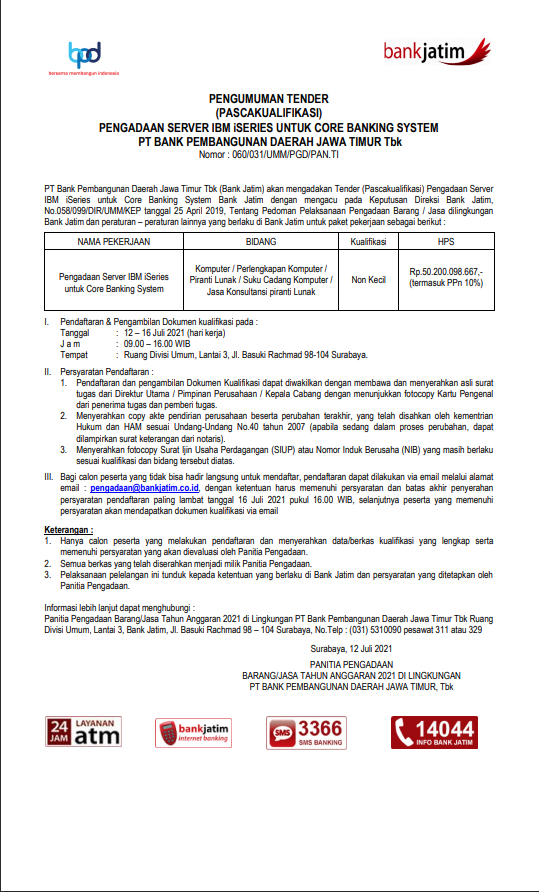 Pengumuman Tender (Pascakualifikasi) Pengadaan Server IBM iSERIES Untuk Core Banking System PT Bank Pembangunan Daerah Jawa Timur Tbk